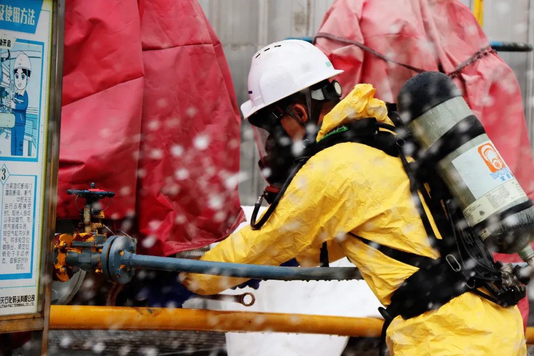 伴隨著對講機中傳來的急促呼喊,此次綜合應急演練正式拉開了帷幕。演練模擬5506儲罐在卸貨過程中罐根軟管發生爆裂,大量苯乙烯泄漏并引起火災、人員中毒等事故。
